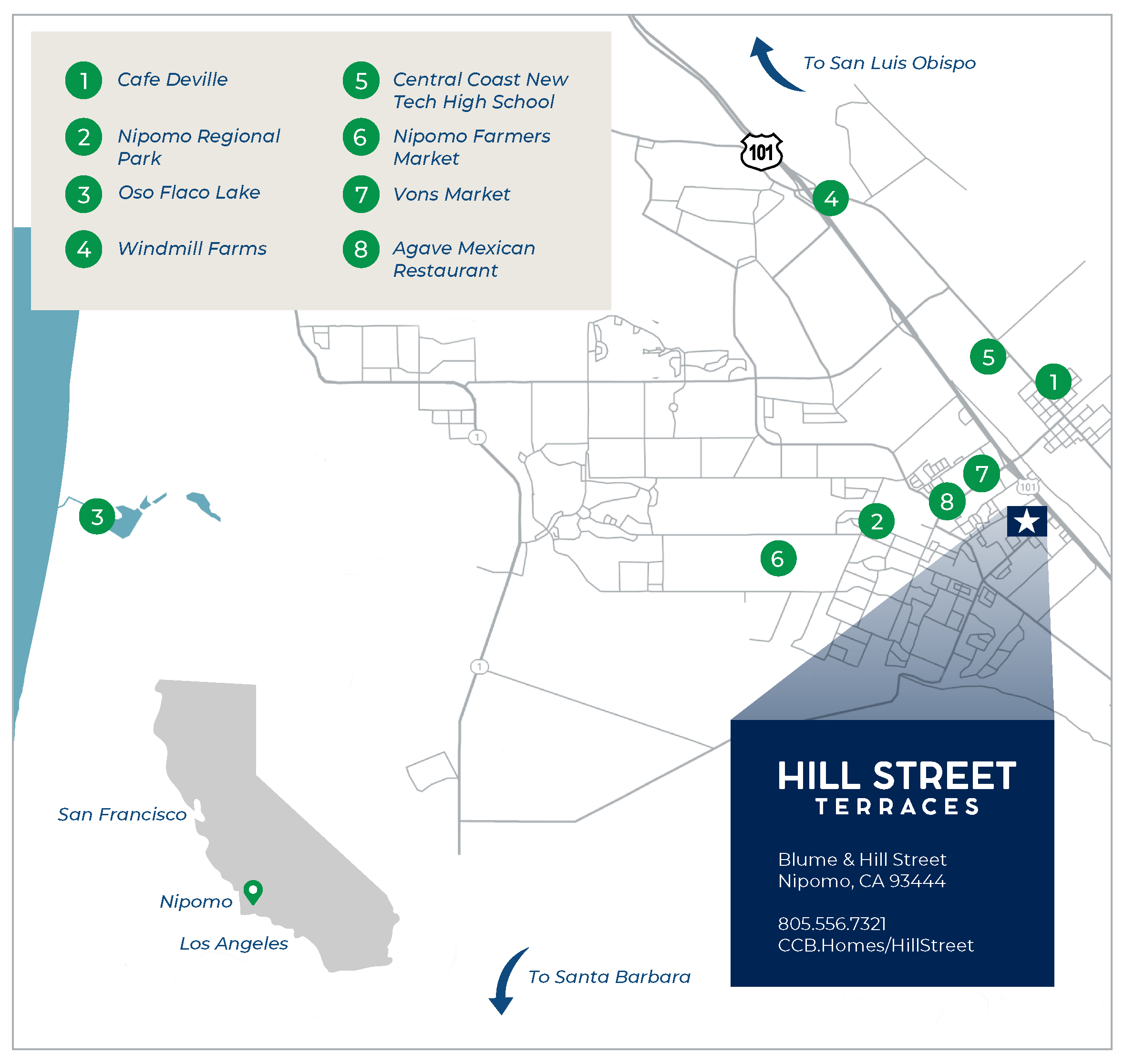 Located at the corner of Blume and Hill Streets in Nipomo, Hill Street Terraces is perfectly positioned to offer the best of Central Coast living. Residents can enjoy proximity to top-rated schools, local shops, and beautiful outdoor spaces. Whether it’s a day exploring nearby hiking trails or a quiet evening in the park, Hill Street Terraces is your gateway to the best the region has to offer.